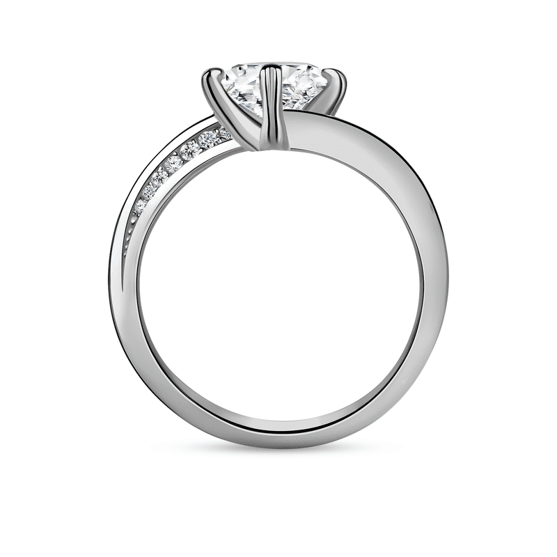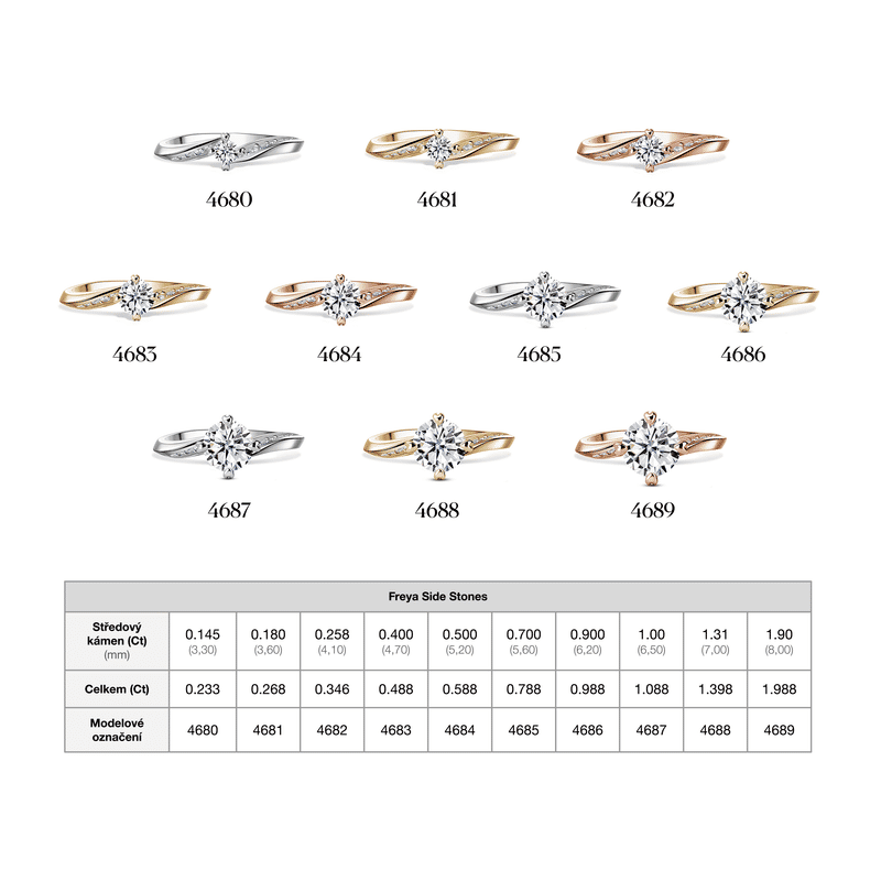 Zásnubní prsten je vyrobený z bílého 14 karátového zlata se středovým briliantem o průměru 6,5mm, který je usazen ve čtyřech krapnách ve tvaru srdce. Obroučka je osázená celkem 14 bočními brilianty, které se směrem od středu zmenšují. Celková hmotnost kamenů ve šperku je 1.088 ct. Šperk je uložen v luxusní dárkové krabičce spolu s certifikátem pravosti.